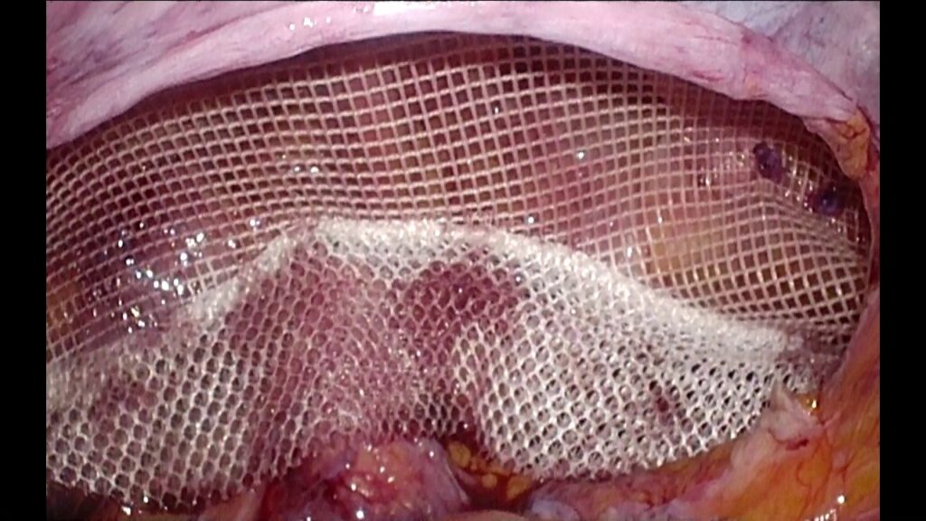 世界の標準的な治療法は脱出している伸びた腹膜を切除し、弱くなった筋膜部を剥離して、丈夫な人工筋膜(メッシュ)を挟み込んで補強を行うことです。当院では通常は下腹部に小切開を行い、前方からメッシュで補強する手術を行いますが、両側にヘルニアがある方や、前方からの手術での再発の方には腹腔鏡でお腹の内側からメッシュによる修復を行った方が合理的なケースがあり、そうした患者さんの場合、腹腔鏡手術を適応としています。