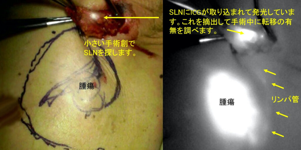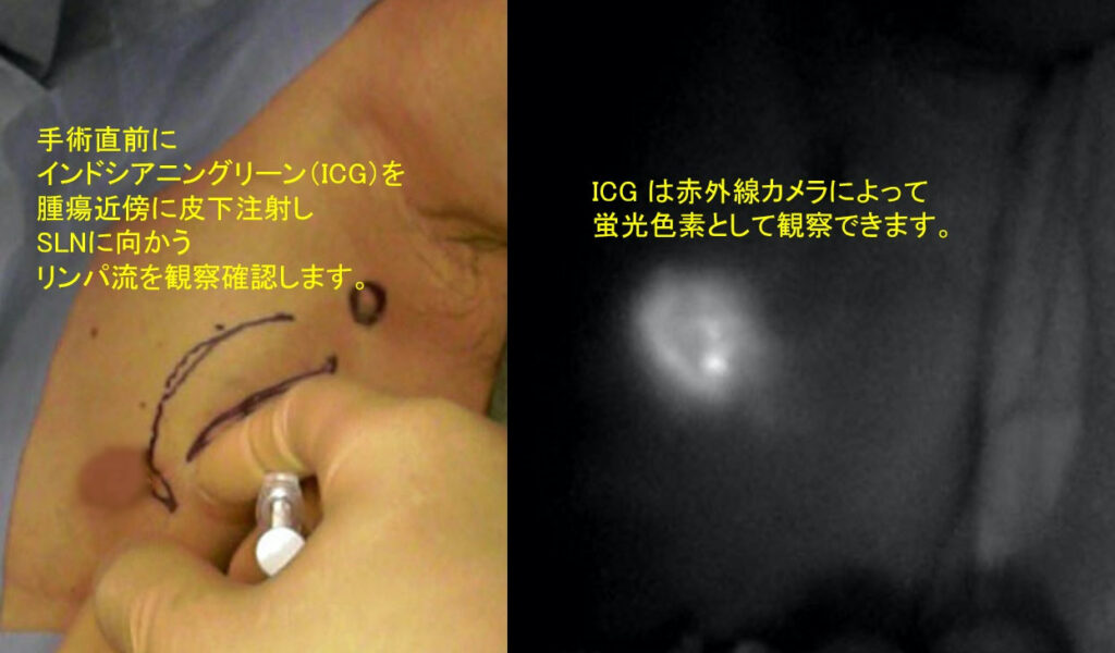 (2)ICG蛍光法:手術時に蛍光色素(ICG:インドシアニングリーン)を腫瘍の周りに皮下注射します。赤外線カメラを用いてリンパの流れに乗ったICGをリアルタイムで追跡し、センチネルリンパ節を検出します。
