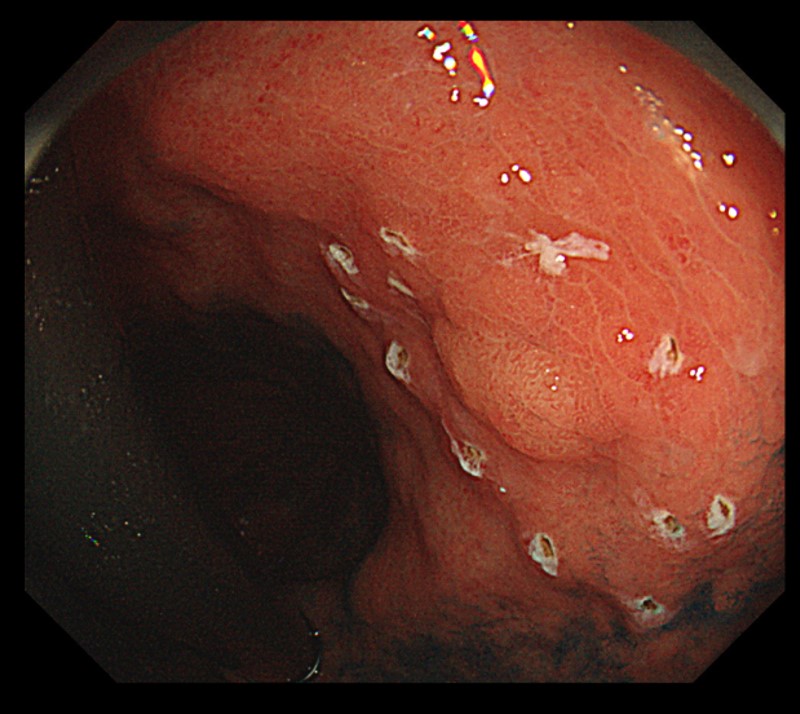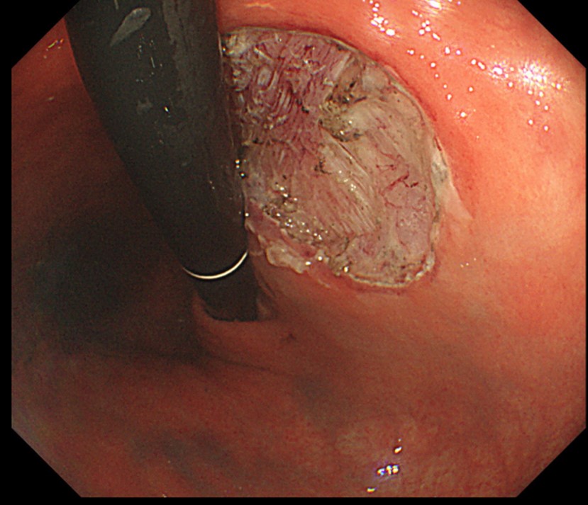 内視鏡的粘膜下層剥離術(endoscopic submucosal dissection;ESD)は、高周波ナイフを用いて病巣周囲の粘膜を切開し、さらに粘膜下層を剥離して切除する方法です。がんが粘膜内にとどまり、リンパ節転移の可能性がほとんどないと判断された場合、ESDの適応となります。胃がんは2006年、食道がんは2008年、大腸がんは2012年にそれぞれ保険適用となりました。ESDでは従来は切除が困難であった病変を内視鏡的に一括で切除することが可能です。病変を確実に取ることで、病理診断(顕微鏡による最終診断)の精度が上がり、追加治療の有無などの必要な情報を得ることができます。食道・胃では約8日間、大腸では約5日間の入院で治療を行っています。当院では2015年6月の開院時から食道・胃・大腸の3領域においてESDに取り組んでおり、年々件数も増えてきています。