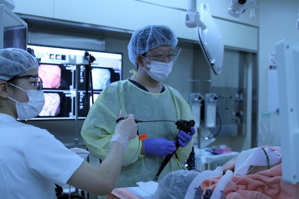食道・胃のESD中は苦痛を軽減する目的で鎮静剤・鎮痛剤を使用し、眠った状態で治療を受けていただきます。本邦では多くの施設で内視鏡室において静脈麻酔(「内視鏡室で行う静脈麻酔」)のもとに行われています。しかし、適切な麻酔深度が得られない場合や、治療が長時間となる場合には患者さんに苦痛を強いてしまうことがあります。当院では長時間の治療が予想される場合や呼吸器・循環器系に合併症をお持ちの方、静脈麻酔が効きづらい方に対して麻酔科の協力のもと、手術室でのESD(「手術室で行う全身麻酔」)を行っています。治療中は麻酔科の医師が全身管理を行うため、より安全に治療を行うことができます。