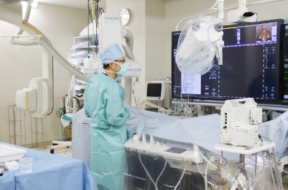 画像下治療(IVR・血管)は血管造影とも呼ばれ、X線と造影剤を用いて体中に張り巡らされた血管網を描出し、様々な検査や治療を行います。当院では、最新鋭のDSA(Digital Subtraction Angiography)装置(図1)を用いて画像処理を行い、私たち消化器内科は腹部・骨盤領域の疾患の治療を担当します。
