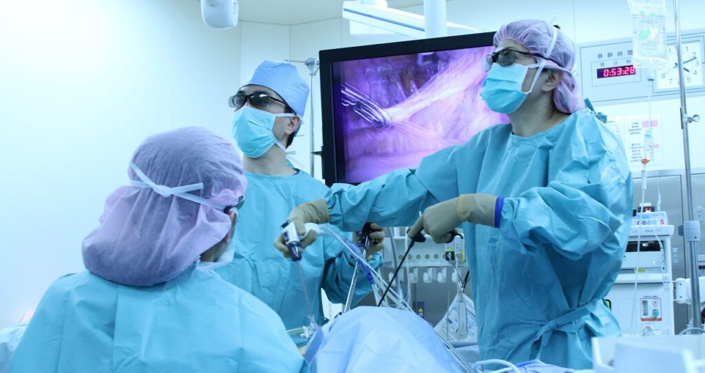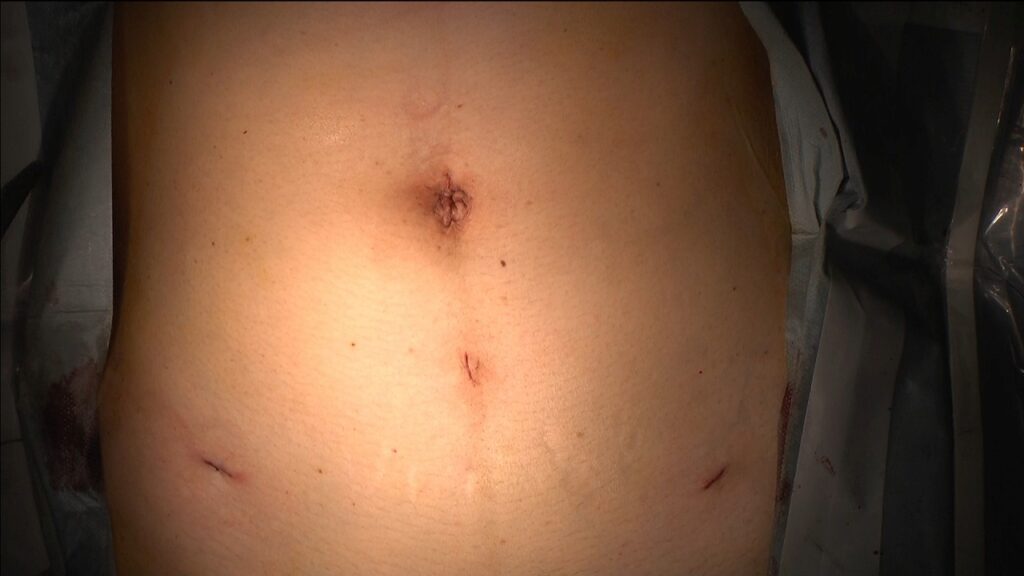 腹腔鏡下手術は従来の開腹手術のようにお腹を大きく切るのではなく、お腹に4か所の小さな穴(5〜12mm)を開けて、カメラで確認しながら手の代わりとなる鉗子を操作して行う手術です。開腹手術と比べ腹腔鏡下手術には、術後の傷の痛みが少ない、傷が目立たず美容面で優れるなどのメリットがあります。また、術後の全身状態の回復が早いため、入院期間は1週間で、デスクワークであれば退院後すぐに仕事復帰可能です。当院では3Dカメラを使用し、日本産科婦人科内視鏡学会の腹腔鏡技術認定医を含むチームで治療を行っています。当院受診後、1~2カ月以内には手術を実施することが可能です。