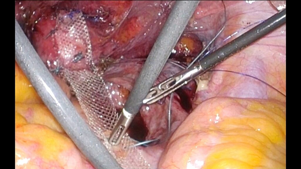 子宮脱は、子宮が正常の位置より下降している状態です。腟の入り口から子宮の一部または全部が脱出する場合もあります。子宮が下降するとき、多くの場合、腟、膀胱、直腸などの臓器も一緒に下降します。脱出した部分が下着などに接触しこすれると、おりものが増えたり、出血したりします。排尿障害や排便障害の原因にもなります。腹腔鏡で観察しつつ、子宮は頸部を残し摘出します。メッシュを用いて子宮頸部を吊り上げ仙骨前面岬角の前縦靭帯に固定します。後腹膜を縫合し終了となります。