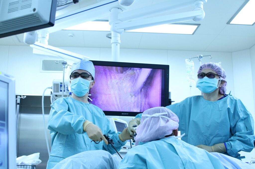 腹腔鏡下手術は従来の開腹手術のようにお腹を大きく切るのではなく、お腹に4か所の小さな穴(5〜12mm)を開けて、カメラで確認しながら手の代わりとなる鉗子を操作して行う手術です。開腹手術と比べ腹腔鏡下手術には、術後の傷の痛みが少ない、傷が目立たず美容面で優れるなどのメリットがあります。また、術後の全身状態の回復が早いため、入院期間は1週間で、デスクワークであれば退院後すぐに仕事復帰可能です。当院では3Dカメラを使用し、日本産科婦人科内視鏡学会の腹腔鏡技術認定医を含むチームで治療を行っています。当院受診後、1~2カ月以内には手術を実施することが可能です。