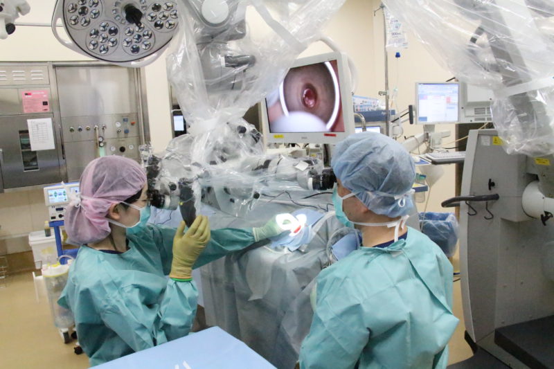 局所麻酔では日帰りで、全身麻酔では3~5日間の入院となります。耳後部の皮膚を2~3mmほど切開し、皮下組織を採取しておきます。外耳道より内視鏡を挿入し、鼓膜を観察できるようにします。鼓膜の穿孔した部分に採取した皮下組織を裏うちするように貼りつけます。その際に血液製剤を用いる必要があります。また、耳内にはガーゼを何枚か入れて血液などが流れてこないようにします。