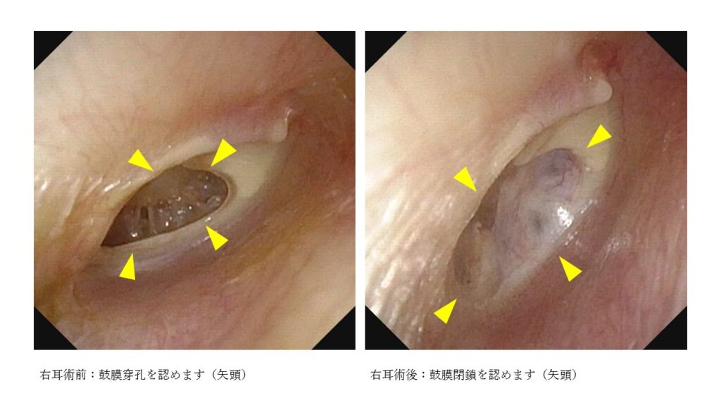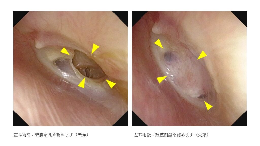 耳後部の創部は術後7日目に外来にて抜糸を行います。耳内ガーゼは何回か交換する必要があり、術後1か月の間は複数回受診していただくことになります。鼓膜が再生するまでに3か月ほどかかります。その間に頭部への強い打撃や気圧が大きく変化するようなことがないように注意する必要があります。具体的にはサッカーや剣道、柔道などのスポーツや、飛行機搭乗、強く鼻をかむなどです。一般的に90%の方で鼓膜が閉鎖します。