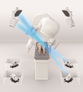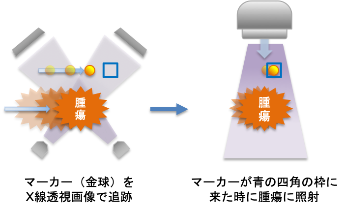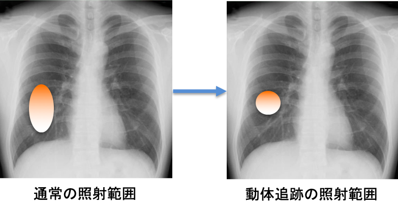 加えて、当院には県内で唯一(2021年4月時点)となる動体追跡システムが導入されています。肺や肝臓などの臓器は呼吸に伴って1cmから2cm程度の上下動を繰り返しています。そのため、ピンポイントの放射線治療を行う際の精度が落ちる可能性があったり、放射線を当てる範囲を大きくしたりする必要があります。治療を行う際、このシステムを使用することで、腫瘍近傍の肺や肝臓の動きをリアルタイムに観測することができ、腫瘍が特定の位置に来た時のみ、放射線を当てることが可能となります。そのため、照射範囲を縮小し、よりピンポイントに、より安全に治療を行うことが可能です。動体追跡を用いた治療を行う際には事前に金製のマーカーを腫瘍近傍に挿入する必要がありますが、そういった処置が可能な場合、当院では積極的に動体追跡を併用した定位放射線治療を行なっています。安全性の問題から動体追跡を併用した方が望ましい場合、新潟市や長岡市などの他の医療圏からの紹介で治療を行うこともあります。現在、当院では早期肺癌や肝臓癌に限定して動体追跡放射線治療を行なっております。対象となる方でご興味をお持ちの方は一度ご相談ください。